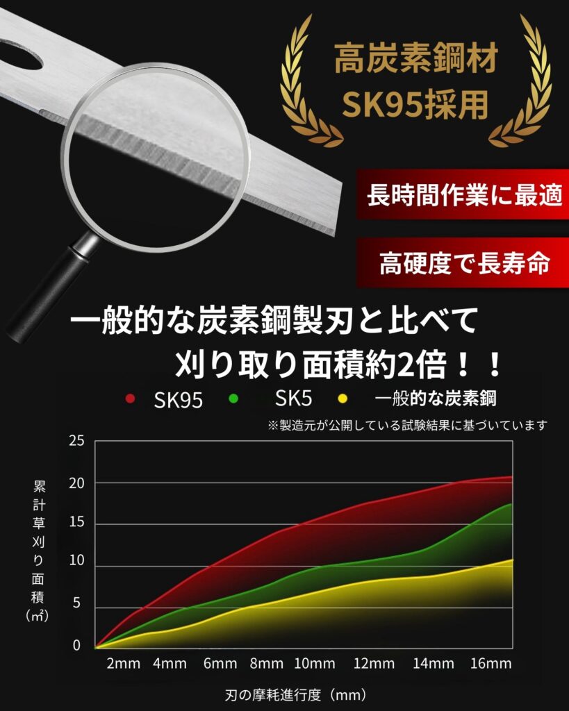 - 寿命が2倍: 一般的な炭素鋼製の刃と比較して、約2倍の作業面積をこなせる耐久性があります 。