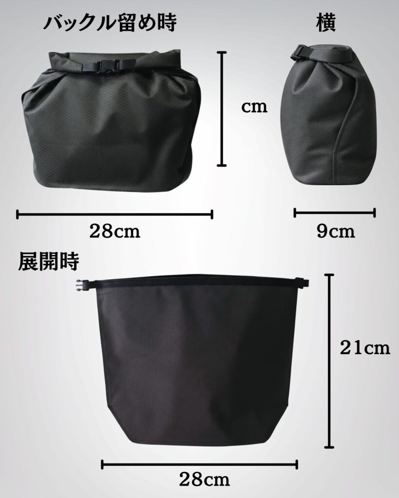 今回紹介している28×21cm・マチ9cmのバックル式モデルは、より大容量で旅行・出張向けの設計です。小さい24×17cmモデルはジムやちょっとした外出向け。用途に合わせて選ぶのがおすすめです。